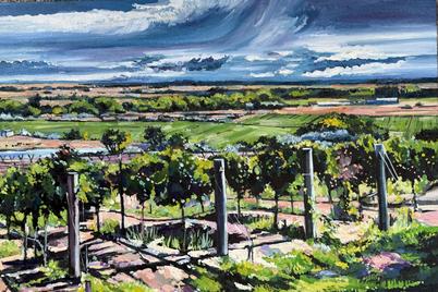 Stephanie moved from Seattle in 2015 with her husband, Storm Hodge, to Parma, Idaho. They purchased Parma Ridge Vineyards and live on 13 acres which includes 9.5 acres of grapes. Idaho brings a different type of landscape all together, as well as living on a vineyard. Stephanie says, “I am blessed to wake up and see the sunrise over the valley every morning and see the sunset every evening. I feel my paintings already starting to change, as this landscape calls for more open and airy, horizontal compositions.” While in the Seattle area, most of Stephanie’s paintings called for vertical orientation, and now being out in the open, she has realized that reflects the feeling of being there. While it is quite beautiful, many times being in an urban setting everything is positioned vertically. Now stepping back from it, she understands her choices more clearly. Idaho continuously inspires her throughout the year with vivid sunsets and the seasonally changing vineyard. She has created a new body of work that is her interpretation and recreation of the landscape in which she lives. Her paintings of the vineyard are also featured on the wine labels for Parma Ridge that can be found in their tasting room and bistro.